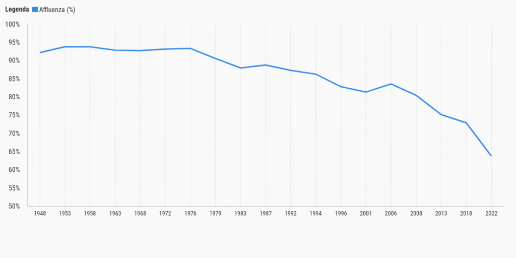 Dopo le ultime elezioni parlamentari è emersa con ancora più evidenza la questione dell’astensionismo. Sono sempre di più infatti gli elettori che non si recano alle urne e il partito del non voto è ormai stabilmente il “primo partito” d’Italia. A partire dalle elezioni del 1979 l’affluenza alle consultazioni parlamentari ha subito un progressivo e quasi continuo calo che l’ha portata dal 93,4% del 1976 al 63,8% del 2022.